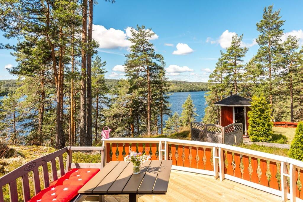 Este cómodo alojamiento ofrece unas impresionantes vistas panorámicas de las aguas resplandecientes y una ubicación fuera de lo común. Relájese en el balcón y disfrute de una indescriptible puesta de sol sobre el agua desde el jacuzzi, date un chapuzón refrescante desde tu propio embarcadero o disfruta de un baño de sauna caliente en las noches frías. ¡Aquí se vive cómodamente durante todo el año y siempre hay algo que hacer! Días de verano tranquilos, bosques repletos de setas y bayas, paseos en barco silenciosos con motor eléctrico y posibilidades de hacer ejercicio en plena naturaleza. ¡Las posibilidades son infinitas!