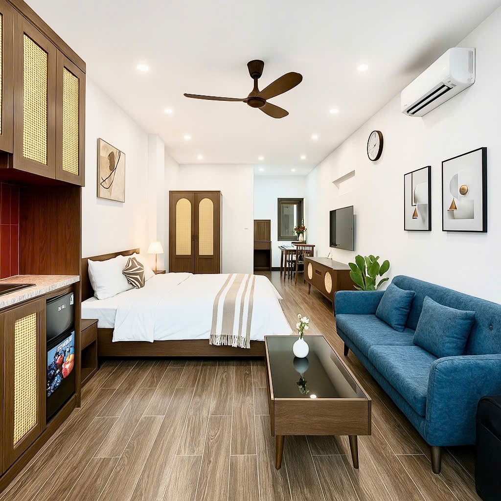 Un apartamento moderno y acogedor a solo 5 minutos de West Lake. Tranquilo, seguro, con un diseño minimalista de beige y madera natural. Totalmente equipado: cama espaciosa, sofá, mesa de centro, armario grande, cocina moderna con nevera, estufa de inducción, lavadora. Amplio balcón con grandes puertas de vidrio para la luz natural. A solo 10 minutos de un centro comercial, perfecto para el entretenimiento. Una opción ideal para una estancia cómoda de corta y larga duración. ¡El apartamento SAMSAM está listo para darte la bienvenida!