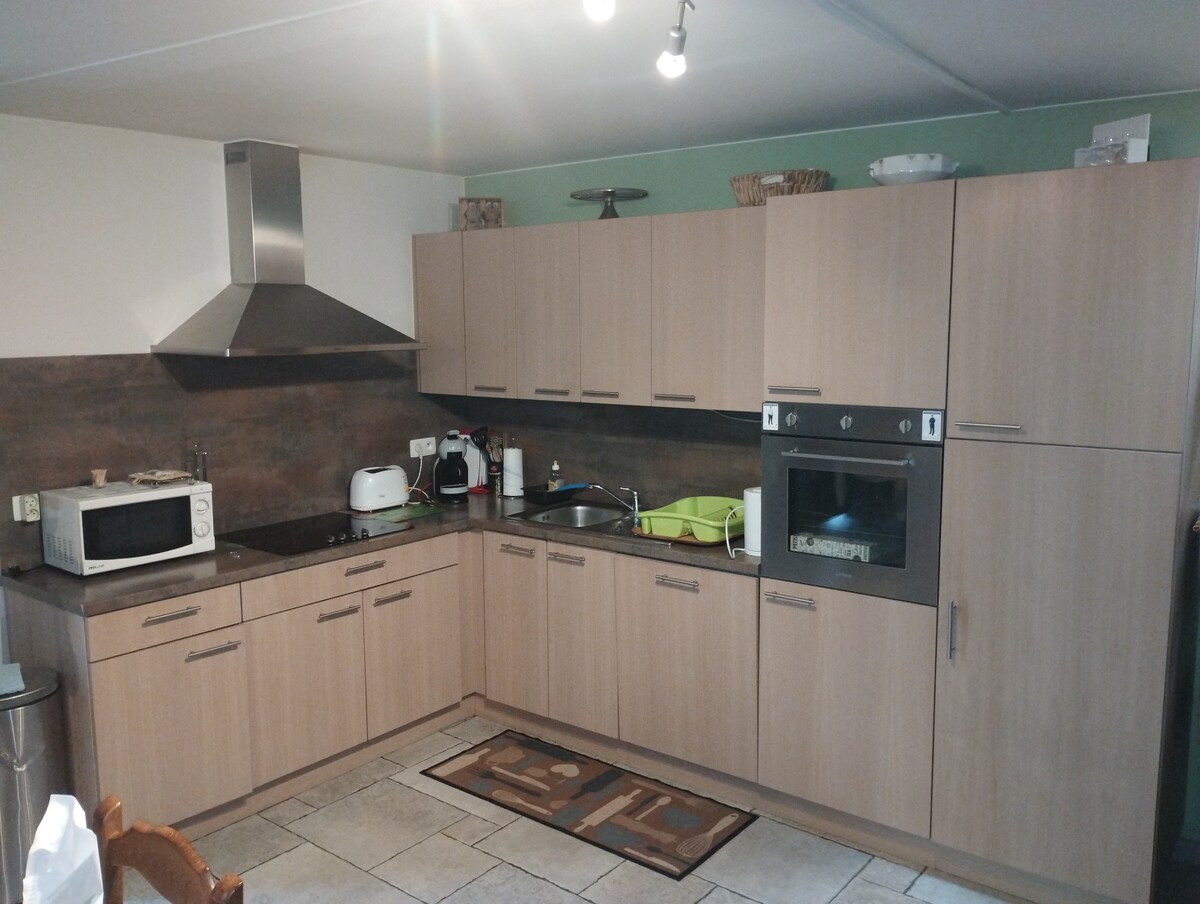 Luminoso pajar renovado en 2021, en el primer piso de nuestras oficinas, con hermosas vistas a nuestro huerto y huerta. Acceso privado a un estudio de 40 m2 (con 1 sofá cama, 1 mesa de comedor+nevera, microondas, café, té, agua, 1 escritorio, 1 cuarto de baño con ducha+WC), 🅿️gratuito en el patio y acceso privado a su encantador jardín con sillas, mesa y tumbona. Opcional de pago: recarga eléctrica, bicicletas, prado vallado con box y agua para un máximo de 2 caballos. Gracias por su confianza, esperamos poder darle la bienvenida. L&N