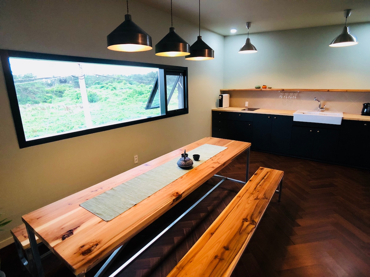 Hola. Queremos crear un espacio que te haga olvidar la congestión del centro de la ciudad con el sonido de las olas del mar. Nuestro espacio, que se encuentra a 20 minutos del aeropuerto, ofrece vistas al mar azul de Jeju desde todas las habitaciones. Composición del espacio Espacio de 12 pyeong de 3 pisos de altura (con ascensor) 1. Espacio de dormitorio : La habitación es un espacio tipo estudio con cocina. Cama, TV de pared, mesa de té y mesa para dos, perchero, soporte, fregadero, aire acondicionado, frigorífico pequeño (congelador separado), inducción 2. Cocina : Platos y utensilios de cocina para 2 personas 3. Baño : Ducha de girasol, toallas, champú, acondicionador, gel de baño, jabón, papel higiénico (por favor, tenga en cuenta que no es posible proporcionar cepillos de dientes debido a la Ley de Control de Higiene). 4. Terraza 5. Zona de barbacoa Ocean barbacoa conectada al mar: 20 000 wones (proporcionamos carbón y parrilla). Al lado del vestíbulo, hay un área de barbacoa separada en caso de lluvia. 6. Estacionamiento: Estacionamiento eléctrico disponible. 7. Solicite por separado la lavandería y la secadora en la entrada del primer piso. Gracias.