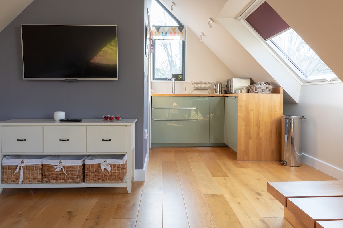 Escondido en la parte superior de una casa de época, hay un apartamento completamente renovado que ofrece excelentes vistas de los alrededores con todos los muebles y accesorios nuevos. El espacio El espacio del loft consta de salón, cocina, dormitorio y baño. Acceso de huéspedes. Los huéspedes entran por la puerta principal de la casa y suben 2 tramos de escaleras hasta su propio piso. Otras cosas a tomar en cuenta Tenemos 2 gatos. También hay una zona de estar en la parte delantera de la casa que recibe el sol de la tarde.