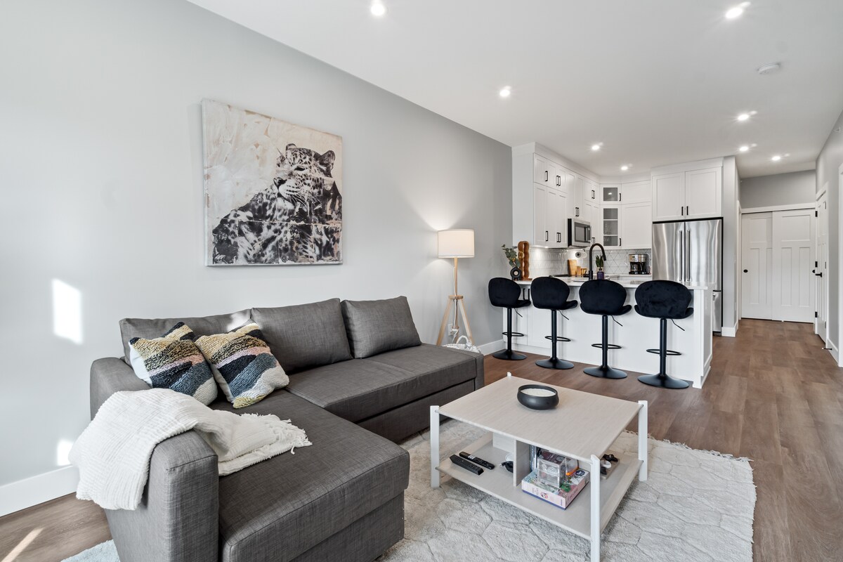 ✦ Al otro lado de la calle de la playa ✦ Capacidad para 4 huéspedes cómodamente Cocina ✦ totalmente personalizada con utensilios de cocina Balcón ✦ privado con vistas de 180° al lago y a la montaña Baño ✦ de inspiración balneario con ducha de lluvia + bañera Techos abovedados de✦ 15 pies en el salón y el dormitorio Wifi ✦ de alta velocidad, televisores inteligentes, Crave y Sportsnet+ ✦ Aire acondicionado, calefacción y lavandería en la habitación Aparcamiento seguro✦ gratuito para 1 vehículo ✦ Se admiten mascotas (una mascota de hasta 13,6 kg)