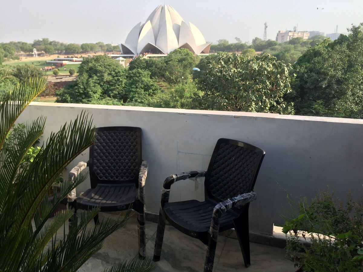 Este es un apartamento tranquilo y independiente ubicado en una exuberante unidad totalmente climatizada que consta de un gran dormitorio con baño adjunto, una pequeña cocina y un balcón. El apartamento está equipado con todas las cosas necesarias, como wifi, teléfono, nevera, aire acondicionado, filtro de agua, gas, utensilios y artículos de tocador necesarios. Tiene una vista panorámica a la vasta área verde abierta de 200 acres, el templo del loto y el lugar de Nehru Con una ubicación céntrica en medio de teatros, restaurantes, mercados, metro y lugares históricos.