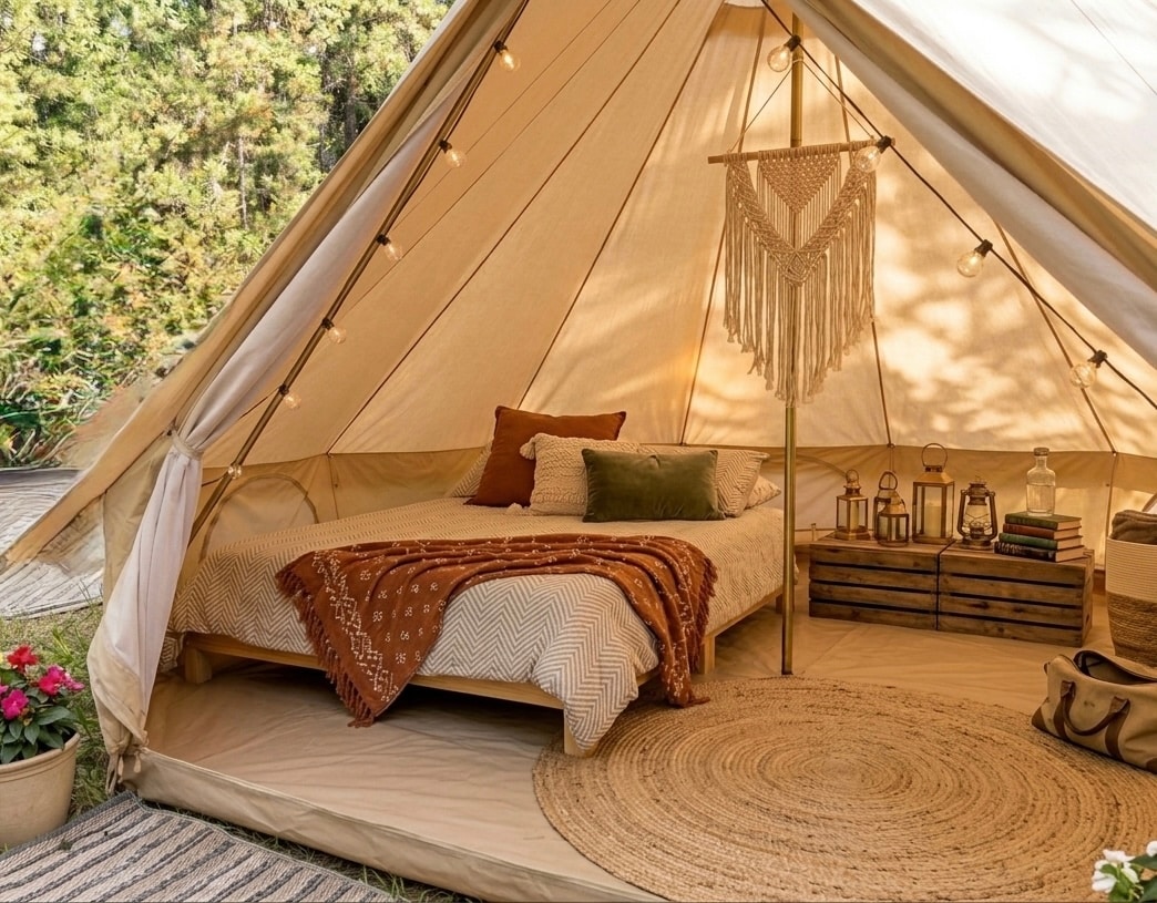 Escape to our curated 5-meter canvas bell tents hidden peacefully within 90 acres of pristine forest. This is "glamping" in its truest form—where quiet luxury meets the rugged wild. Our spacious, airy sanctuaries feature a minimalist boho aesthetic- each bell tent includes: • Plush Queen Bed: High-quality linens and cozy blankets for a perfect forest slumber. • Boho Accents • Large doors open to your private site—ideal for starlit evenings.
