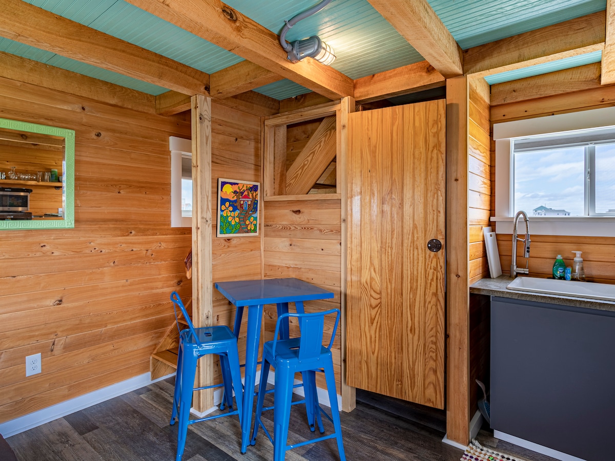 Vivir en una casa pequeña... ¿Puedes hacerlo? ¡Ven a probarlo en esta pequeña casa de 240 pies cuadrados en la playa! La pequeña casa personalizada está a pocos pasos del mar en un terreno semi-frente al mar. Disfruta de la terraza exterior de varios niveles con un paisaje exuberante o pasa el rato en la planta superior con ventanales del suelo al techo y una vista perfecta del muelle de Rodanthe. El interior exhibe amplios suelos de pino, solapas de ciprés y escaleras de nogal americano personalizadas con incrustaciones de caoba y detalles de cedro vivo. La cocina tiene mostradores de hormigón y un fregadero de granja.