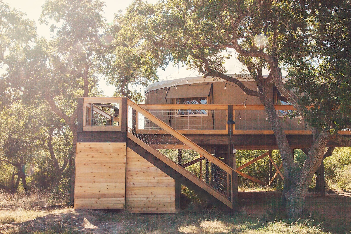 Esta yurta en el árbol única en su tipo es tu escapada PERFECTA de la vida urbana. Ubicado en el corazón de la región vinícola y cervecera de Texas, ¡sus excursiones de un día están a solo minutos en todas las direcciones! ¡Este alojamiento de un dormitorio (cama tamaño king) es ofrecido por el mejor anfitrión nuevo de 2022 de Airbnb en el estado de Texas! ¡Relájate en el spa, contempla las estrellas o siéntate alrededor del fuego bajo un Live Oak Tree de 300 años! ¡La yurta de roble enredada está escondida en una hermosa propiedad de 9 acres y ofrece todas tus comodidades modernas, además de una cama tamaño king!