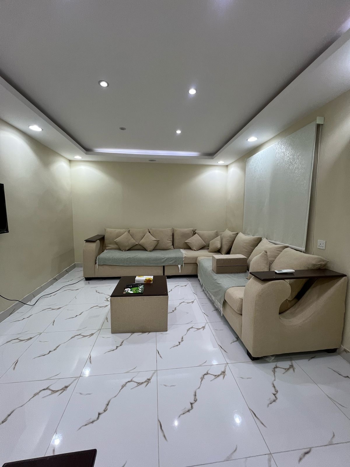 شقة أنيقة بتصميم عصري وألوان هادئة تتميز بصالة واسعة وكنب مريّح للاسترخاء يمنح المكان الراحة والفخامه