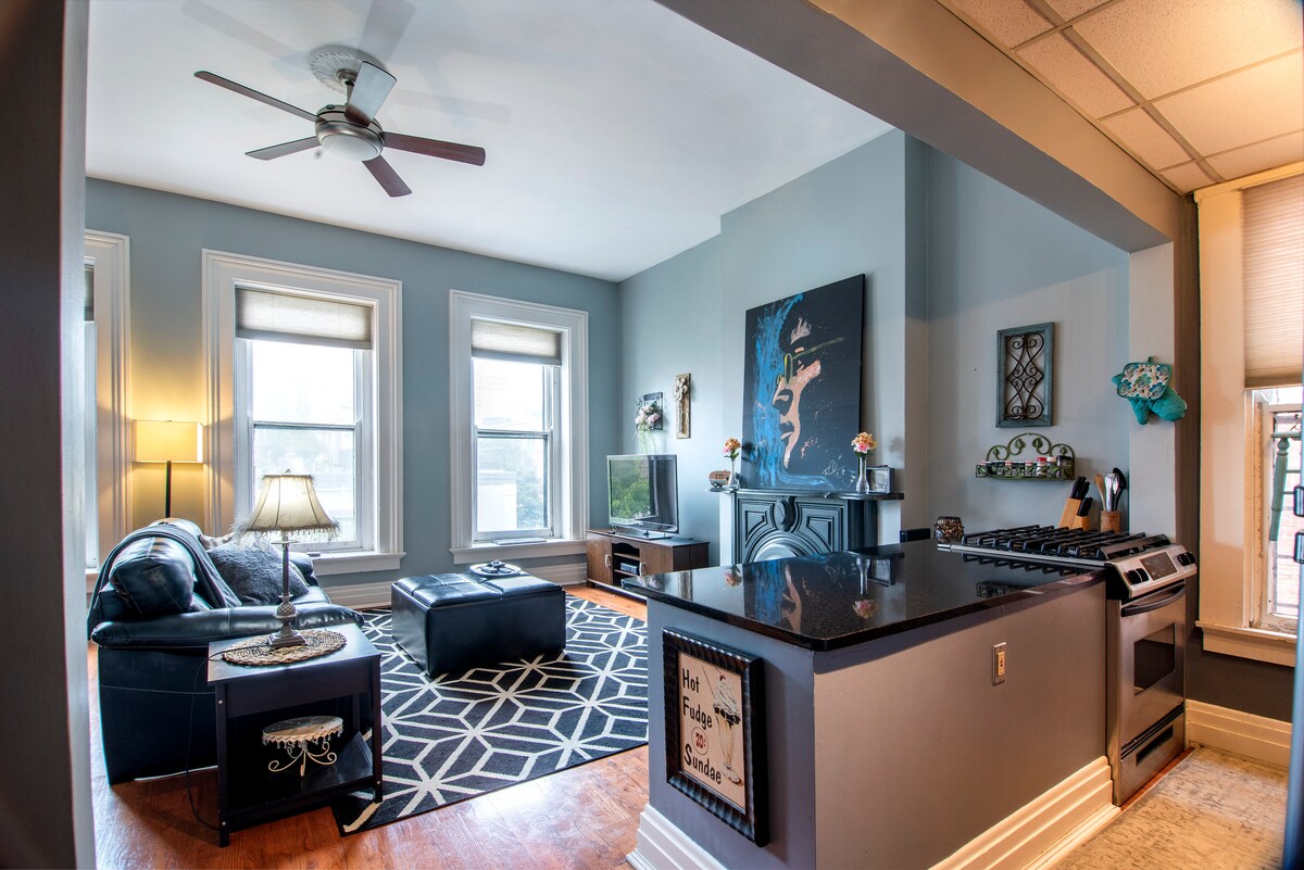 ¡Apartamento de un dormitorio en el último piso en medio de Cincinnati! A poca distancia a pie de todo lo que la ciudad tiene para ofrecer. Salón/cocina de concepto abierto, un dormitorio y sofá sofá, con capacidad para 4 huéspedes. ¡Espacio perfecto para viajeros de negocios, aquellos que buscan explorar Cincinnati o residentes que buscan una alternativa a un hotel para salir por la noche!