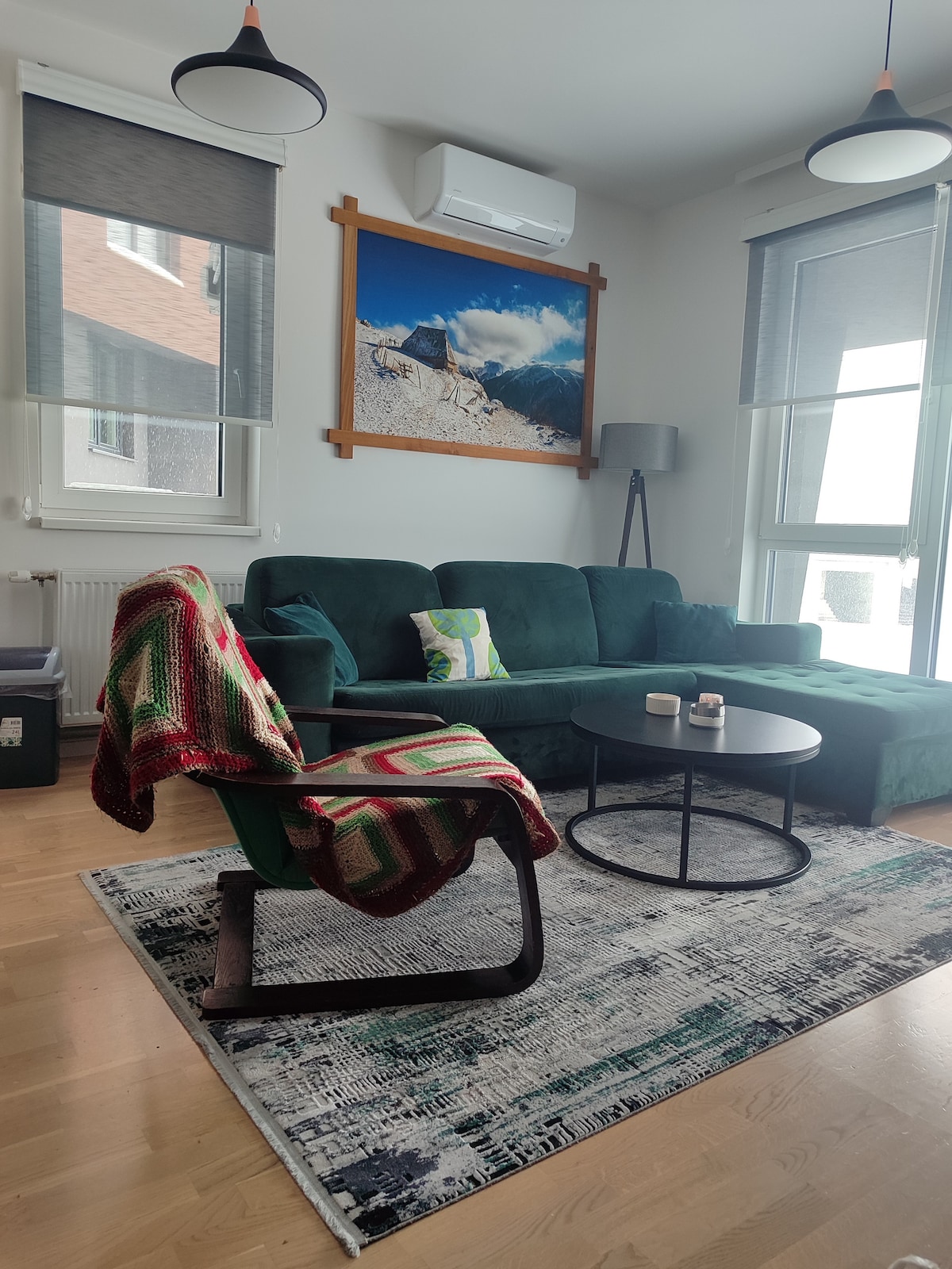 Este apartamento amueblado cómodo y lujoso tiene una amplia sala de estar, cocina abierta totalmente equipada, mesa de comedor, sofá cama, dormitorio con fantástica cama, baño con ducha y aseo. Nuestro apartamento tiene una terraza/balcón privado muy espacioso (19 m2) con asientos al aire libre y tumbonas, desde donde puedes disfrutar de impresionantes vistas a la montaña y a Bjelašnica, tanto en verano como en invierno.