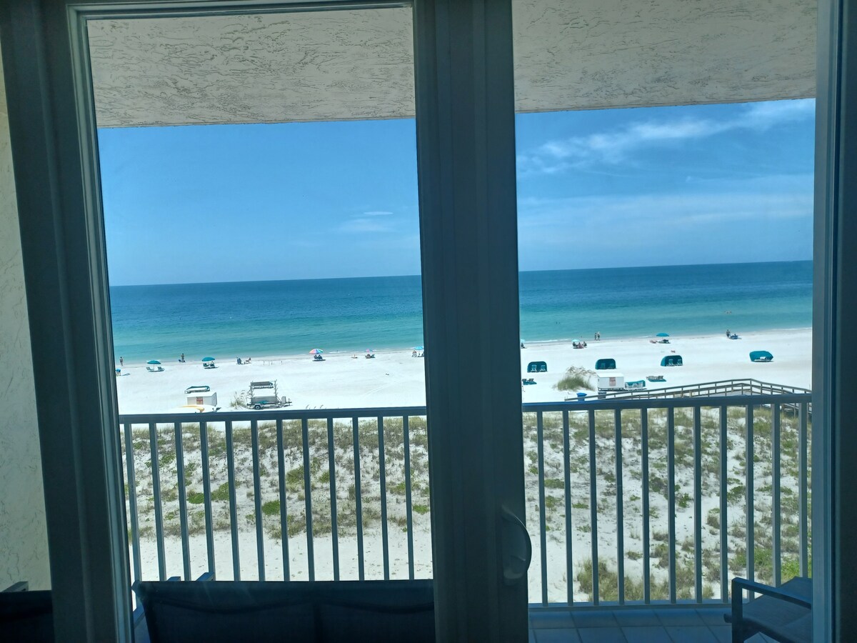Increíbles vistas a la playa desde tu apartamento de vacaciones y desde tu balcón privado. Apartamento de propiedad privada recientemente renovado en el Island Inn Beach Resort en Treasure Island, Florida. Treasure Island está junto a St. Pete Beach, al sur de John's Pass, Madeira Beach, Indian Rocks y las playas de Clearwater. Bar en la piscina, piscina climatizada en la playa, cocina con placa de dos quemadores, ollas, sartenes, cafetera, microondas y mucho más.