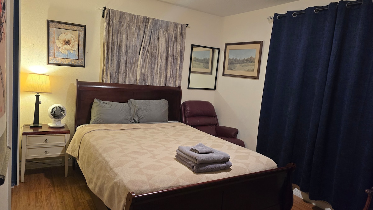 Espacio para 2. Estudio privado, entrada privada, estacionamiento enfrente. Prohibido fumar en el estudio. Gran ducha privada con suavizante, cabezal extraíble, cama tamaño king, televisión en color, cable, wifi. Mesa lo suficientemente grande como para ser utilizada para trabajar, microondas, cafetera, tostadora, nevera, cómoda, cajonera con almacenamiento colgante y ropa de cama incluida. Hay una sala de estar en la parte delantera para fumar y relajarse. Se ha añadido una unidad de aire acondicionado/calefacción instalada junto con nuestra unidad de sistema central estándar de la casa principal para mayor comodidad controlada por ti.