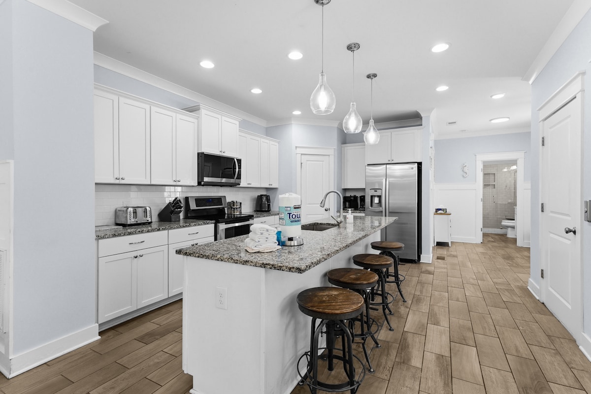 Orgullosamente seleccionado por HGTV como uno de los nueve “Wow Worthy Vacation Homes and Design on HHI”, junto con la HGTV Dream Home 2020. Esta lujosa casa ofrece una vida sin problemas en el interior y en el exterior y una generosa cocina de granito. Durante tu estancia, disfruta de las comodidades del hogar, desde el lujoso sofá modular y los televisores inteligentes, hasta la cama tamaño king de hotel y el baño privado en la suite principal. Disfruta de la vida interior/exterior de tu propia villa privada en la exclusiva comunidad Greens de Shipyard Plantation.