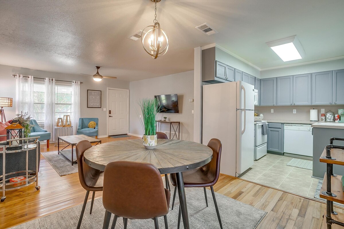 Te encantará relajarte en esta acogedora casa del centro de la ciudad, justo al lado de la plaza histórica de Granbury. ¡Camina a excelentes restaurantes, tiendas y entretenimiento! Una cama tamaño king, un sofá plegable y una cocina totalmente equipada garantizan comodidad y conveniencia durante tu estancia. Relájate en el patio trasero totalmente vallado con chimenea de propano.