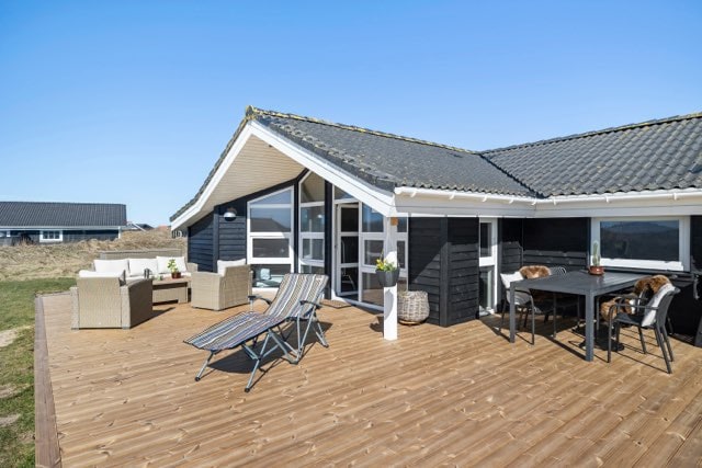 Hyggeligt og familievenligt sommerhus med god plads både inde og ude kun 300m fra skøn sandstrand og Vesterhavet. Rummeligt og lyst med god plads. Dejlig TV-stue med vinduesparti mod vest - perfekt til at nyde solnedgangen. Dejlige nord, syd- og vestvendt træterrasser omkring sommerhuset. Stort badeværelse med toilet, brus og sauna. Der accepteres ikke ungdomsgrupper eller fester. Gæster skal selv medbringer sengetøj, håndklæder og viskestykker.