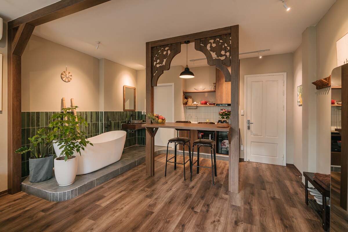 Descubre Hanói desde este condominio boutique en el casco antiguo, a solo unos pasos de TRAIN STREET, el LAGO HOAN KIEM, el TEMPLO DE LA LITERATURA y la CIUDADELA IMPERIAL DE THANG LONG. Diseñado cuidadosamente para tu comodidad, cuenta con una CAMA KING SIZE, COCINA PRIVADA y un PROYECTOR FULL HD CON PANTALLA DE 100 PULGADAS. Tanto si te sumerges en la BAÑERA DE MADERA como si contemplas las vistas de la ciudad, cada detalle invita a la relajación. Una mezcla perfecta de ubicación céntrica y refugio sereno.