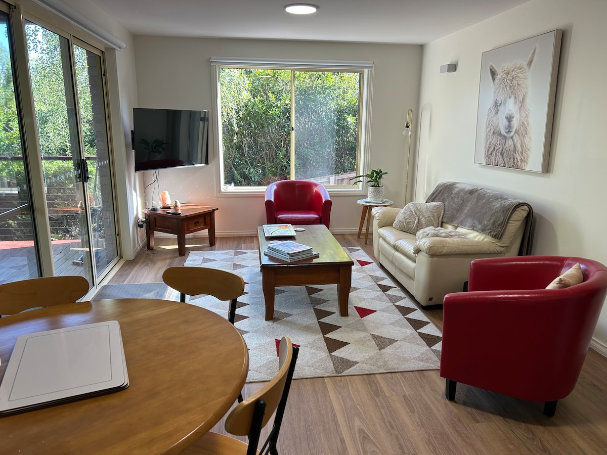 Take it easy at this unique and tranquil getaway. Relax on the big outdoor deck or under the shade of the olive tree. There are cafes and shops nearby . CBD is 10 minutes drive away. Mona is 15 minutes. The base of Mt Wellington is also very close for those keen bush walkers.
