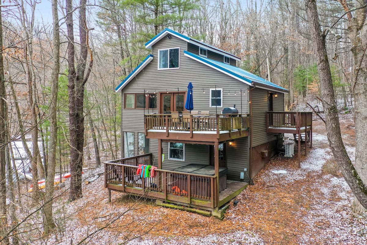 Hidden Lake Lodge is a 3000 sq ft cabin w/ 5 bedrooms, 3 bathrooms + add'l 1500 sq ft of decking outside. Sleeps 18 in beds. AirBnB maxes guest count at 16. You'll have access to 30 acres + our semi-private lake. You do not need a fishing license here. For adult-only stays: max of 14 guests (all must be 28+ w/ proof of ID) Starlink WiFi, Hot tub, shuffleboard, arcade, foosball, kayak, fireplace, fire pit, washer/dryer, gourmet kitchen, games, propane + charcoal grills. Parking fits 8 cars.