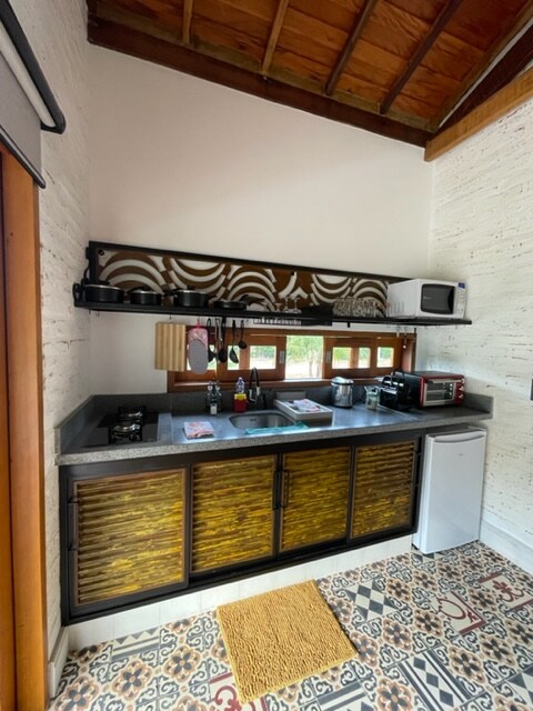 Relaxe neste lugar único e tranquilo. Casa inteira de vidros e rodeada de mata (estadia integrada à natureza, com conforto e romantismo). Sente na varanda aprecie o sol nascer. Pequena cozinha com utensílios. Acesso gratuito ao lago, caiaque, cascata, piscina, PetFriendly (pets dóceis c/ humanos e animais). Crianças > 13 anos Fogo de chão / churrasco de parrilla. Aqui habitam insetos e pequenos bichos. Alguns restaurantes entregam; temos um mini-mercado.