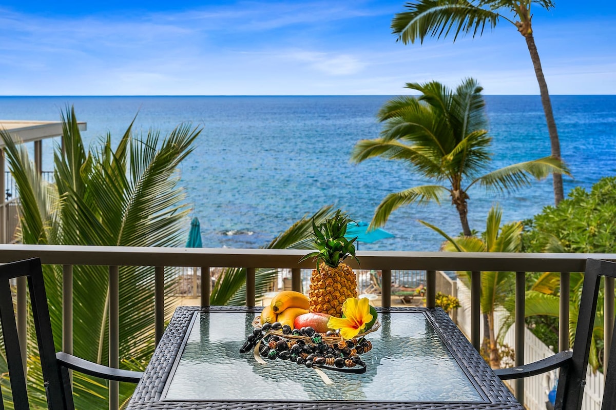 🌊Absolute direct oceanfront top floor, two-bedroom condo located in the heart of Kailua-Kona, Hawaii. Step inside to stunning ocean views from floor-to-ceiling windows and your private oceanfront balcony — welcome to paradise! 🌴 🌬AC in all spaces, elevator access (zero steps!), fully updated with high-quality furnishings throughout. From the balcony, watch sea turtles in the tide pools below, spot dolphins just offshore, and enjoy spectacular sunsets — all just steps from the ocean.