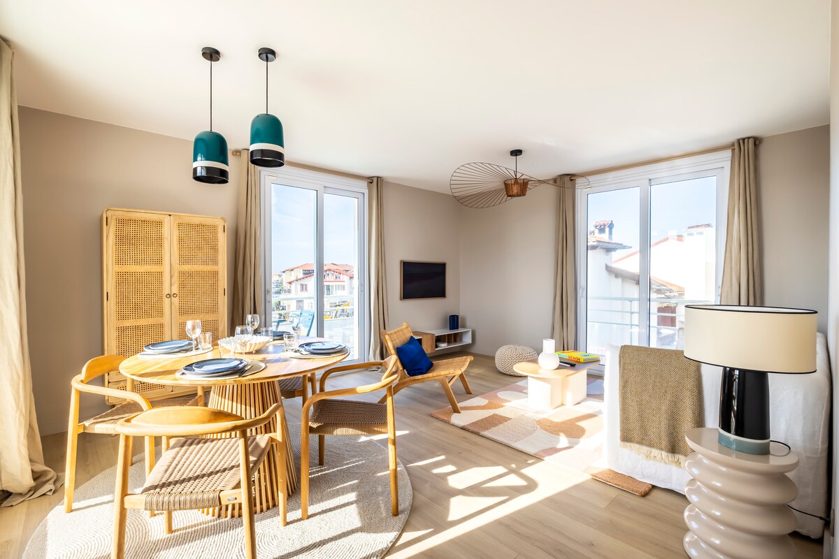 Repensar el espacio de una pequeña zona no es fácil, pero algunos arquitectos hacen maravillas. Un apartamento moderno, orientado al sur y al oeste, completamente reformado con materiales de alta gama. ¡Las sábanas y toallas también están incluidas ! También disfrutarás de una terraza con vistas impresionantes de las montañas del País Vasco y las playas con los mejores lugares para surfear en el mundo. Todo a 5 minutos a pie: estacionamiento, restaurantes, bares, alquiler de surf.