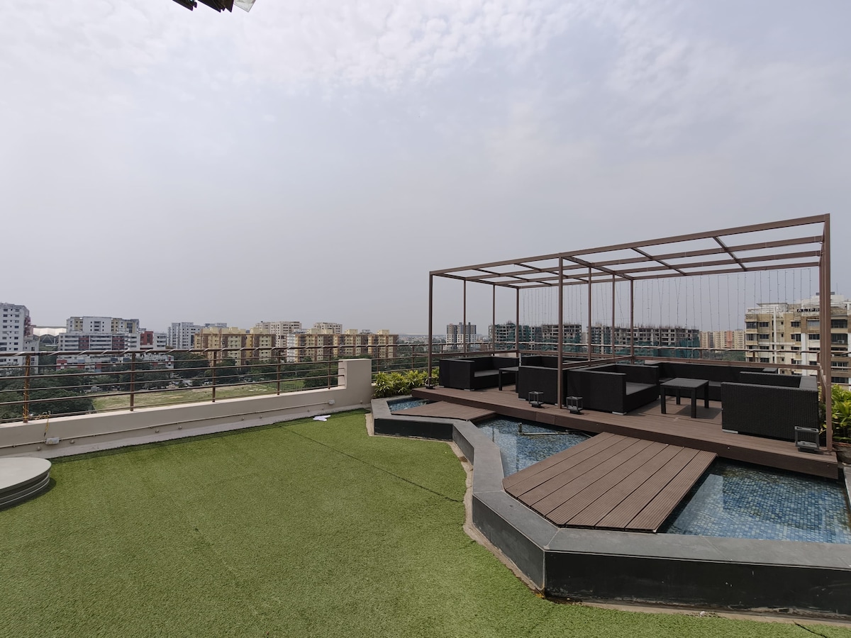 Forget your worries in this spacious and serene space. It is Incredible India homestay establishment (approved by ministry of tourism, Govt of India). It has a private swimming pool and terrace overlooking a golf course. Away from city crowd. Can walk into adjacent Five star Resort Vedic Village with Spa, restaurant, coffeeshop, Naturotherapy etc Forty min drive from NS Bose international Airport, Kolkata(15km)Can reach Nearby attractions like Eco park, Wax museum, Nicco park within 20 min drive