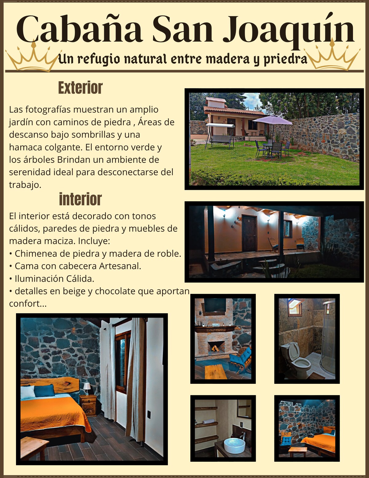 Cabaña campestre para 4 adultos y 2 niños, construida totalmente en madera con 50 m² acogedores y funcionales. Ideal para pareja o familia pequeña, rodeada de ocotes, encinos y más de mil plantas de colores. Cuenta con techo panorámico para disfrutar de la luz natural y el cielo estrellado, baño con techo de cristal, cocina equipada, comedor, Wifi y zona segura. Pet friendly con costo (150 pesos). Es obligatorio cumplir el reglamento para garantizar seguridad, armonía y la mejor experiencia.