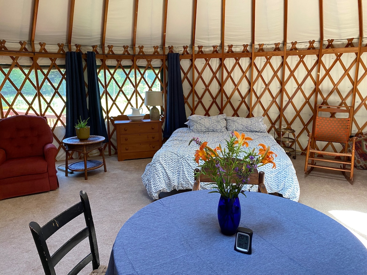 La yurta de 30 pies en el extremo sureste de las Catskills, ha servido como estudio de arte, conservando una sensación de calma de relajación y energía creativa. El espacio circular es sencillo y cómodo. Las grandes ventanas y la terraza privada dan a una suave pendiente que conduce a un estanque pintoresco. Es posible que te despierten pájaros cantores, el avistamiento de una garza, un colibrí o un ciervo. Los sonidos de los peces o las ranas y los sonidos generales de la naturaleza por la noche comienzan cuando el sol se pone sobre la montaña. ¡Disfruta!