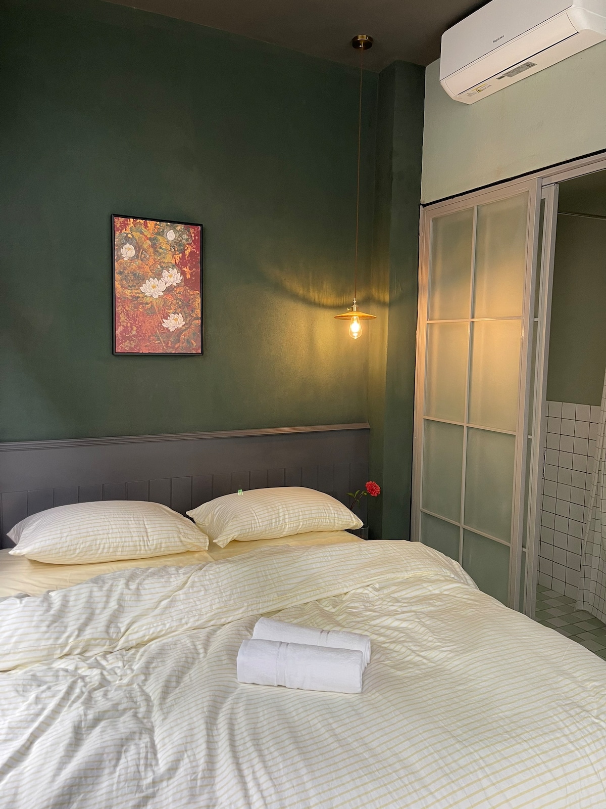 Tịnh Room (Calm) – Inspired by the sense of calm and tranquility, Tịnh Room offers a peaceful and cozy space designed for comfort and relaxation. Set in the heart of Huế’s Imperial area, the room features a cozy queen bed, a private bathroom, and a rooftop balcony overlooking the Imperial City. Just steps from the Citadel and a short walk to the Hương River and Thiên Mụ Pagoda, with a green park and lively local market nearby, it’s an ideal base to explore Huế and local life.
