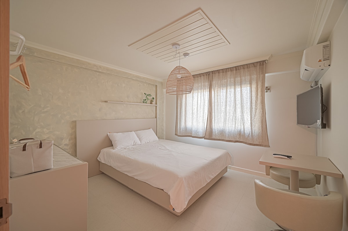 Hello. It is located on a cliff in the center of Seogwipo, so it has a perfect ocean view with permanent views. It is a one-bedroom type, but unlike other one-bedroom types of accommodations, it provides a large area, The bedroom, living room, and kitchen are completely separated, making it an efficient movement. We would like to provide breakfast in a wonderful space that boasts the best sea view along with a shared swimming pool to give you comfort and comfort on your trip to Jeju.