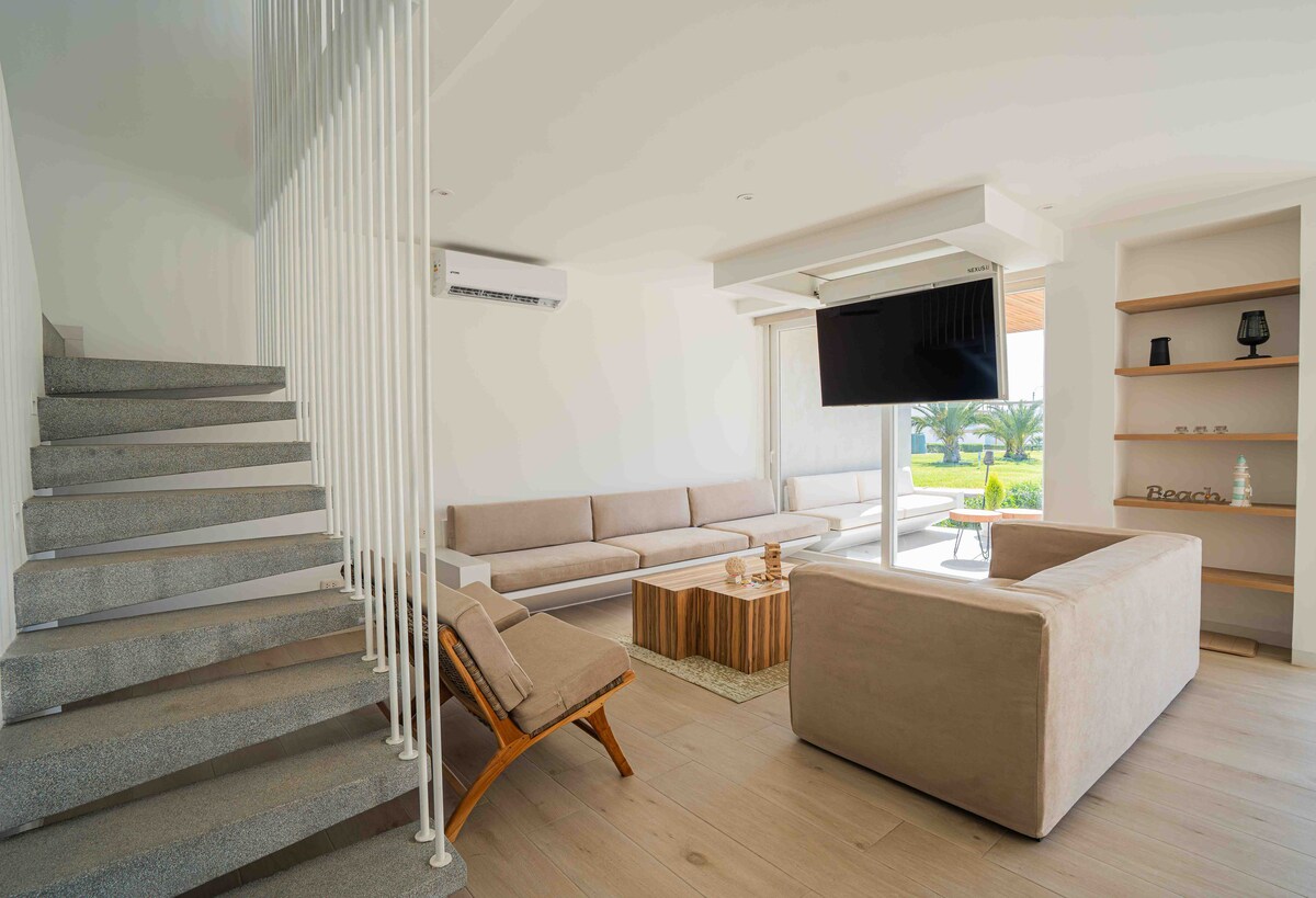Bonita casa de playa en primera línea. Vista hermosa a toda la inmensidad del mar, desde la terraza, desde la cama y balcón principal, desde la cocina, desde la sala principal y sala de estar, desde la puerta cerca al bar. Relájate en un lugar tranquilo con brisa marina, cielo azul y sonido de las olas. Descansa en la hamaca, en las tumbonas Refréscate en la piscina! Internet Satelital Starlink, ideal para trabajo remoto, realiza videollamadas en HD (Zoom, Teams, Meet), toda la familia conectada