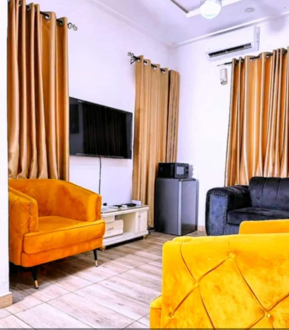 * Ubicado en el centro de una finca cerrada. * Electricidad las 24 horas * Internet de fibra óptica * Sala de estar amueblada contemporánea con un sofá de cuero. * Lavadora * Televisores inteligentes de pantalla grande, Netflix, DSTV, reproductor de CD/DVD * 2 dormitorios y 2 baños en suite con Smart TV en la habitación. * Totalmente climatizado * Cocina totalmente equipada * Baños de baldosas con calentador de agua y ducha presurizada * A 3 minutos del centro comercial/Shop-rite de la ciudad de Ikeja. * A 10 minutos del aeropuerto local y a 15 minutos del aeropuerto internacional * Limpieza de la casa
