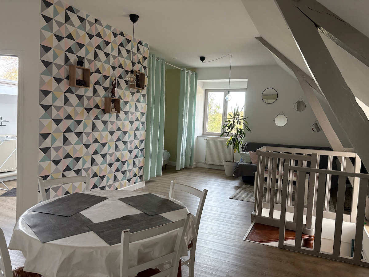 Gîte cozy au calme, avec 1 chambre séparée. Tout équipé dans un style atelier avec poutres apparentes. Au 1er étage d’une petite maison indépendante (pas de location en bas), vous apprécierez sa terrasse en bois, sans vis à vis exposé sud/ouest. Idéal pour vos séjours loisirs ou professionnels, pour un week end, quelques jours, ou semaines...Situé dans le centre bourg de Breteil et à mi chemin entre la capitale Bretonne (20km), et la Forêt mythique de Brocéliande (24km). accès train 8mn à pied