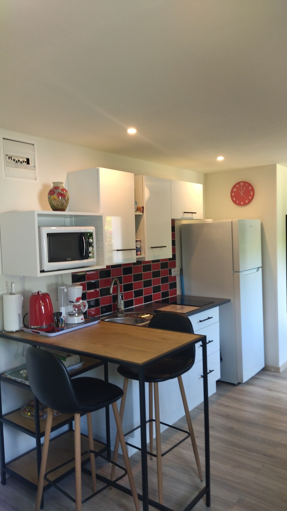 Relájate en este alojamiento tranquilo y elegante Te alojarás en un estudio situado a 2,5 km del centro de Caen y de la estación de tren. Parada de tranvía (Modigliani) a 200 metros. Cama doble hecha a la llegada, TV, wifi (fibra), cocina equipada (vitrocerámica, nevera, microondas con grill, Dolce Gusto), baño con ducha/WC/lavabo/secador de toallas, lavadora secadora Sábanas y toallas incluidas Situado en la planta baja con terraza privada Estacionamiento y estación de carga gratuita en nuestro patio privado.