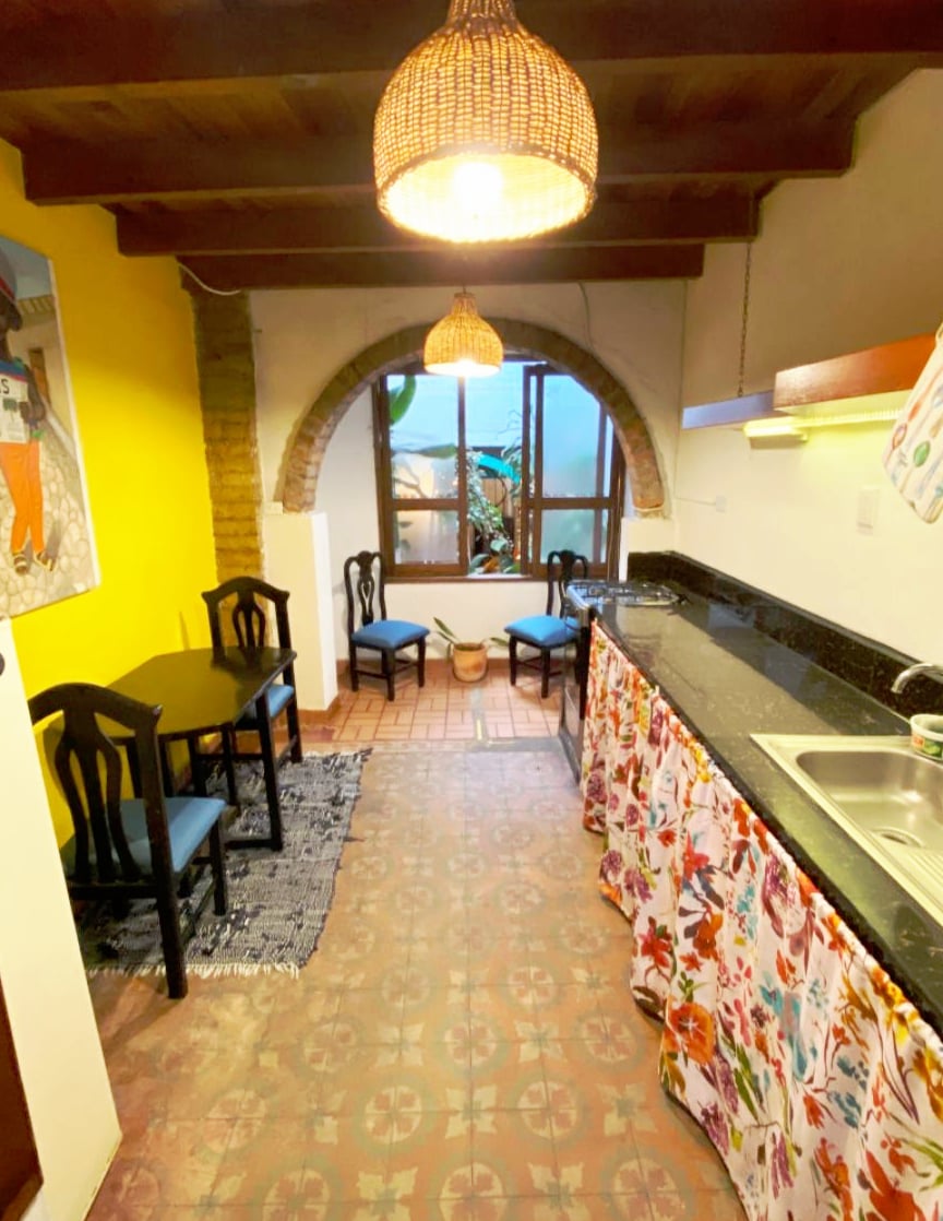 The house is right in the middle of San Antonio, but without having to walk up any of the area's steep hills. Beautiful, tranquil Colonial home with original architecture located in Cali's most popular neighbourhood. This oasis has a running fountain. The house has this private apartment and three separate bedrooms. Here you are only seconds away from restaurants, cafes, bars, a park and salsa schools. The house has two floors with different areas to socialise, chill, read and work.