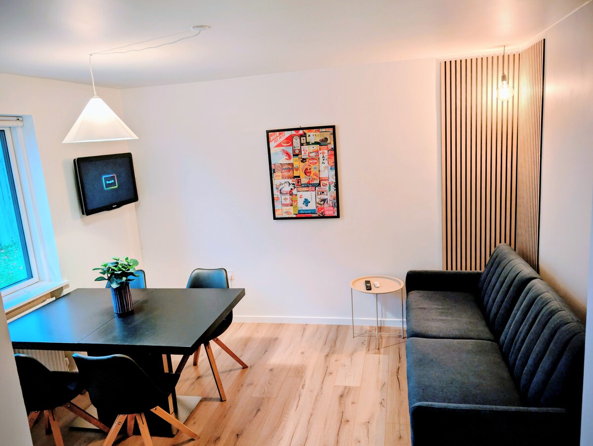 Ubicado en el centro, con aparcamiento gratuito y puntos de carga eléctrica justo enfrente de la casa. Tienda de comestibles con panadería y delicatessen. Pizza en la misma calle. También hay una carnicería, con delicias y comidas preparadas. Hay un buen parque infantil para niños pequeños y mayores. Entrada privada al apartamento en 1. Sal. Vivo en la planta baja y a menudo puedo ayudar con preguntas. Puedo ayudar con juguetes y cosas para niños más pequeños. Hay una caja de seguridad. NO se pueden traer mascotas ni fumar en el interior