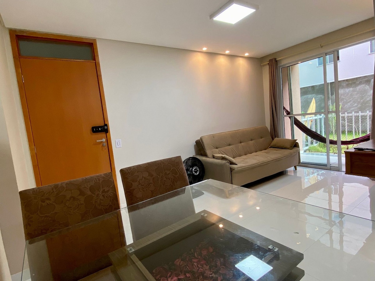 ¡Apartamento en planta baja, nuevo, decorado y equipado para que su estancia sea inolvidable! Frente a las mejores playas de Ilhéus Situado en un condominio cerrado, con conserjería las 24 horas, sala de juegos, parque infantil, gimnasio, red de protección para mascotas pequeñas, wifi, lavadora, secadora y plancha de pelo. Aire acondicionado en 2 habitaciones y ventilador en la 3ª, cuente con mi ayuda para que su viaje sea especial y acogedor. Ropa de cama por una tarifa. No tenemos toallas de baño.