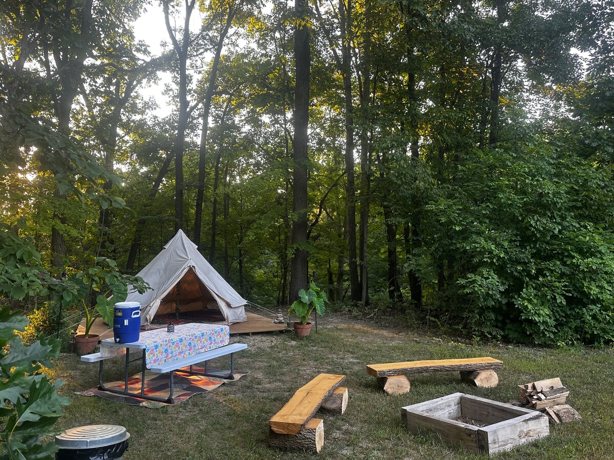 Te invitamos a alojarte en Hidden Ridge, un escondite privado en el bosque ubicado en Otter Lake, Girard, Illinois, para vivir una auténtica experiencia de acampada. Se proporciona una tienda de pared de 14 x 16 con una cama tamaño queen y un baño separado con una zona para cocinar al aire libre. Hay mucho espacio para tiendas de campaña, catres o colchones de aire adicionales.