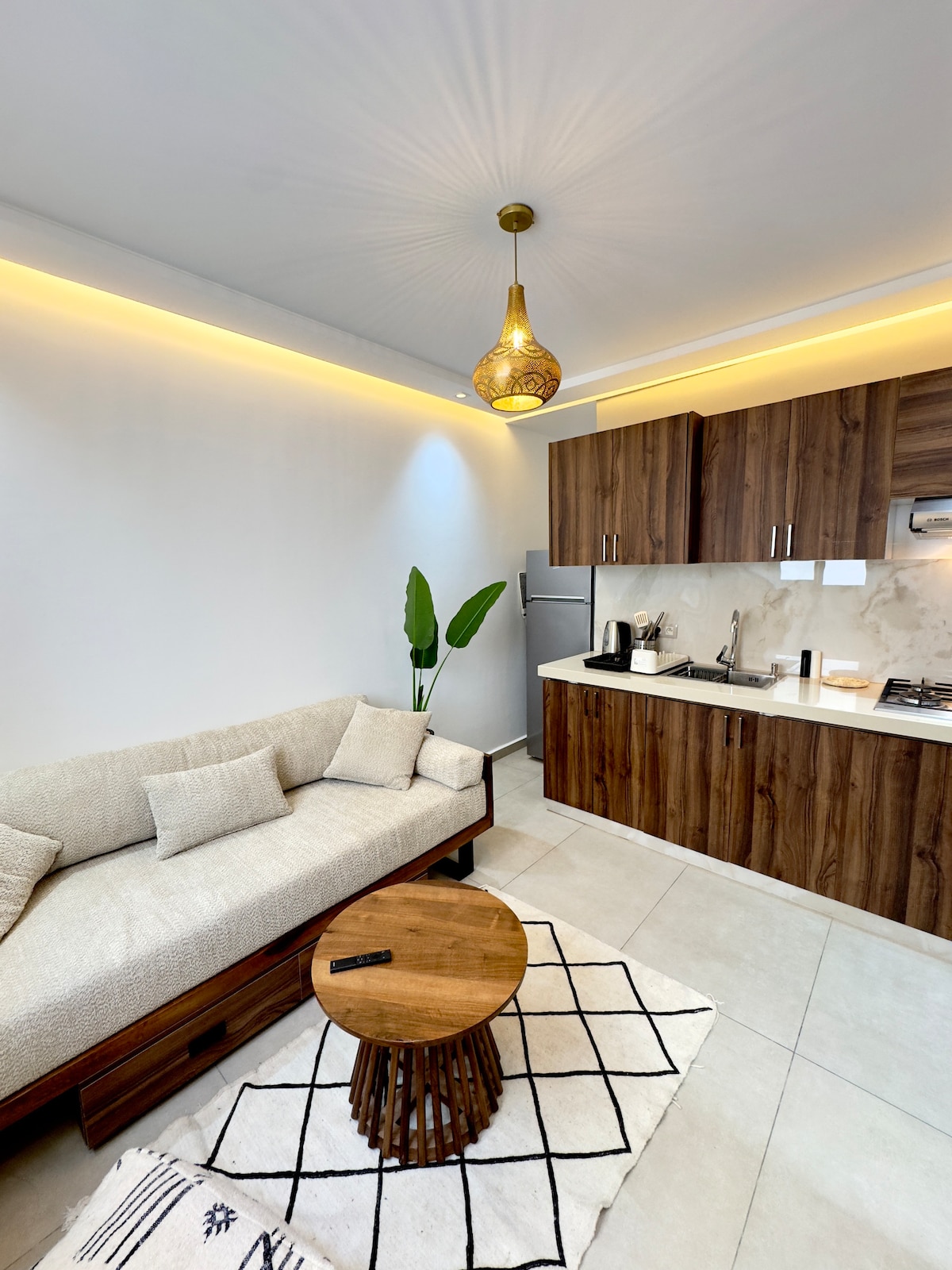 Un moderno apartamento tipo estudio con un toque marroquí. La sala de estar de diseño abierto cuenta con un cómodo sofá con almohadas, que funciona como cama supletoria, TV inteligente con Netflix, WiFi de alta velocidad y una cocina totalmente equipada. El dormitorio incluye una cama tamaño queen y un armario con riel para colgar, cajones y cestas tejidas para guardar cosas. El baño tiene ducha a ras de suelo, espejo iluminado, lavabo, dispensador de jabón, estante de artículos de tocador. Perfecto para surfistas y aquellos que buscan comodidad y tranquilidad en la costa.