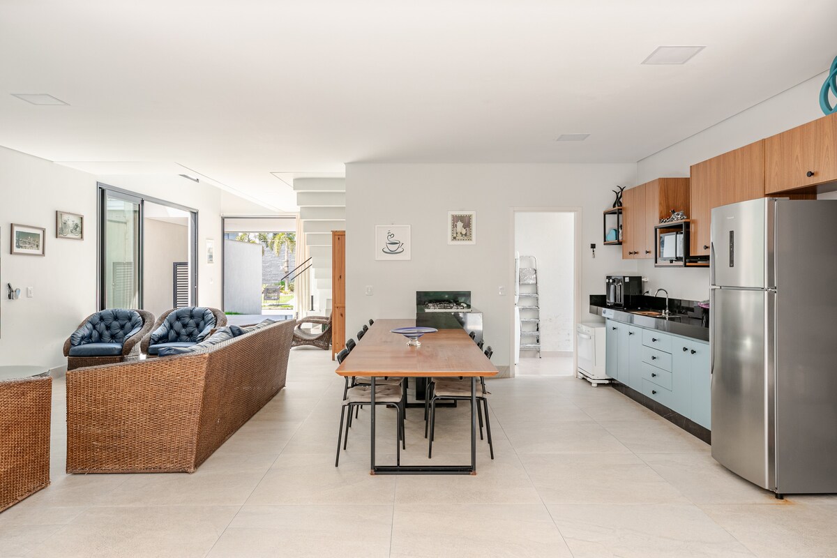 A true haven for those seeking tranquility, privacy, and security, two blocks from the beach. Single-story house with high-quality, 4 fully equipped and very comfortable suites, and an extra bedroom/living room for more than 13 guests. The house was designed down to the smallest detail for a complete lodging experience, with integrated, spacious environments and incredible landscaping. A complete gourmet kitchen with barbecue, bar, lounge, and heated pool, patio!