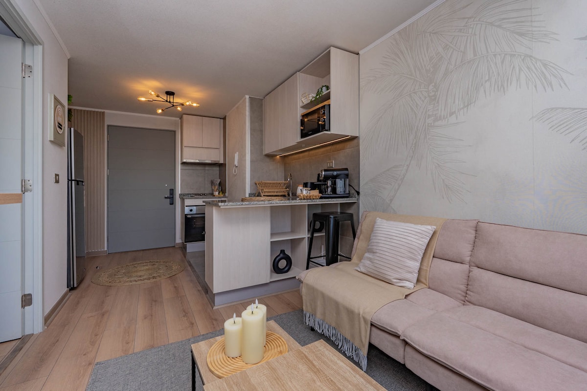 Luminoso departamento, bien equipado con piso flotante en living y dormitorio. El dormitorio tiene cama Box Spring de 2 plazas, impecables sabanas, tiene un Smart Tv led cuenta con Netflix , internet via wifi. La cocina cuenta con refrigerador, horno eléctrico, microondas, tostador, ollas y utensilios de cocina para cocinar. Tiene loza y cuchillería completa. Si esta mas de 6 noches dejo sabanas de recambio. El balcón cuenta con una terraza con mesa y 2 sillas.