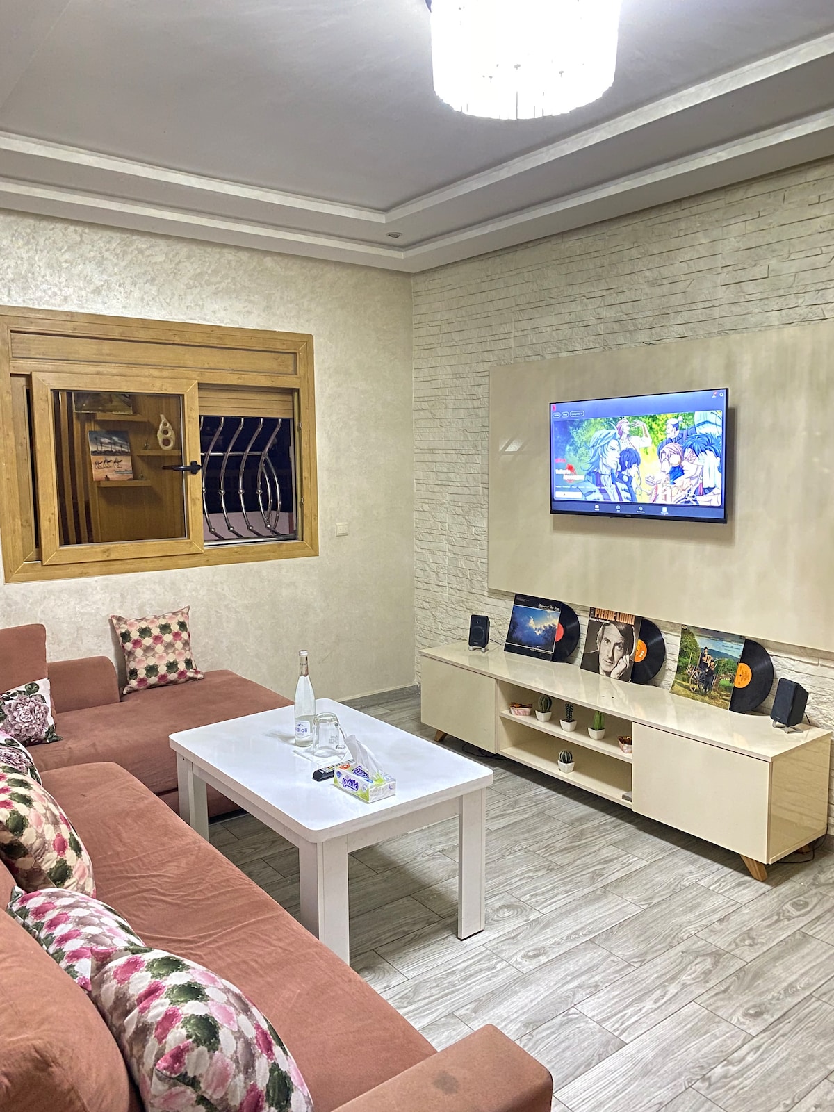 Excellent, bright apartment in Agadir, host city of the 2025 Africa Cup of Nations, just a 2-minute walk from the bustling Souk Elhad bazaar, offering all the comforts needed for a pleasant stay. It includes: 2 bedrooms: one with a double bed and the other with two twin beds, a living room with IPTV and Wi-Fi, a dining room, a fully equipped kitchen, a bathroom with toilet, and a spacious terrace perfect for relaxing. The location is close to all amenities and the city center. 2km from the beach