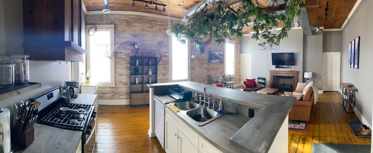 El loft está en el centro del lago Odessa, encima de una tienda. Impresionante para estancias nocturnas o más largas. Tiene paredes de ladrillo, revestimiento de granero, techo a la vista, camas Murphy y chimenea. Baja las escaleras, a las tiendas de antigüedades, una fabulosa heladería antigua, de temporada. La playa pública está a poca distancia a pie. Este sería un lugar increíble para celebrar una fiesta con un grupo de amigos, sin embargo, no se puede usar para eso. Tiene que ser más discreto, hay un alquiler por noches debajo del loft. Es ideal para relajarse.