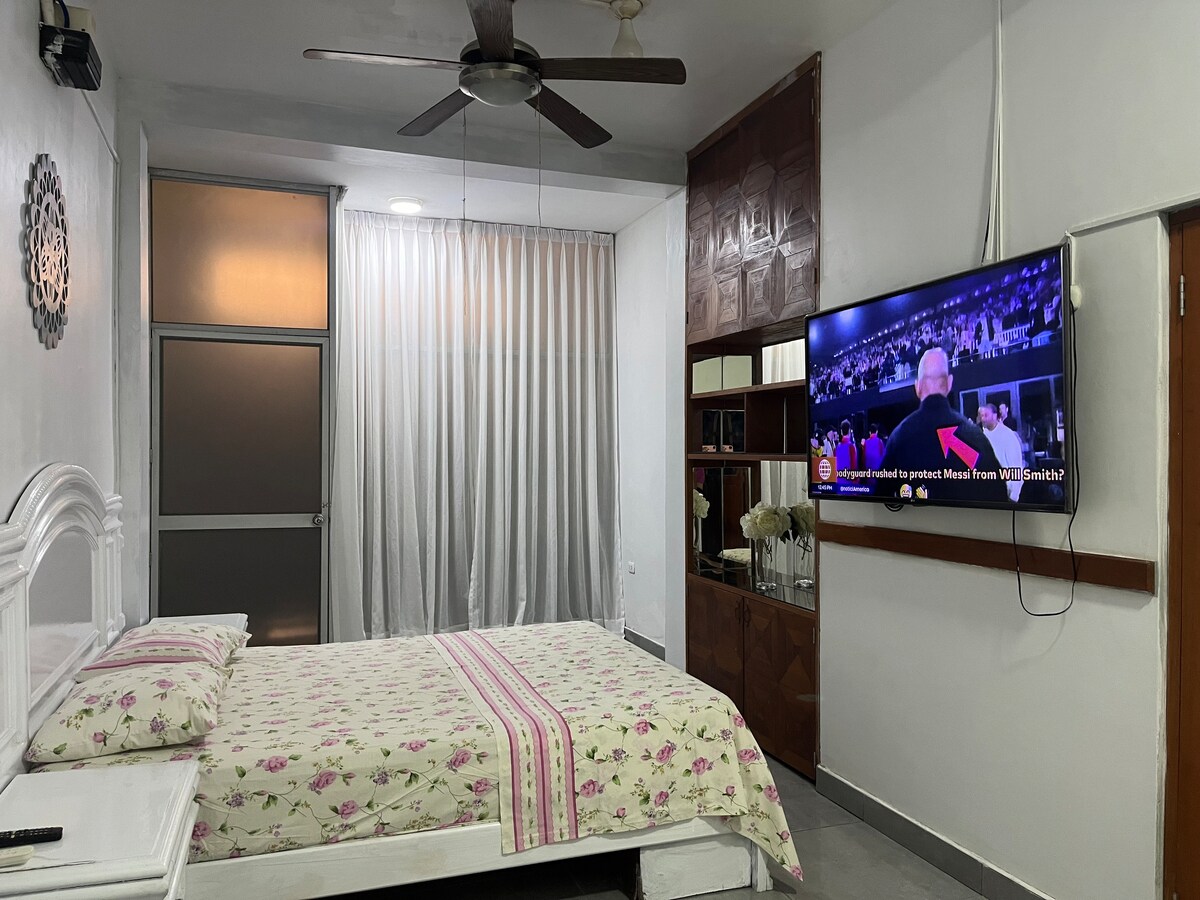 Habitación con aire acondicionado, cómoda, confortable, limpia, tranquila y segura. Tiene guarda ropa, plancha eléctrica, mesa de noche con lámpara, toma de corriente cerca a la cama para carga de celular, cama confortable de plaza y media, Tv. cable, Wi Fi, mesa de trabajo y sillón de estar. Solo para Huéspedes cocina comedor, refrigerador, lavadora. Ideal para persona que viaja por negocio o turismo. Se brinda sabanas, toallas, servicio de limpieza de habitación, SS.HH. privado.