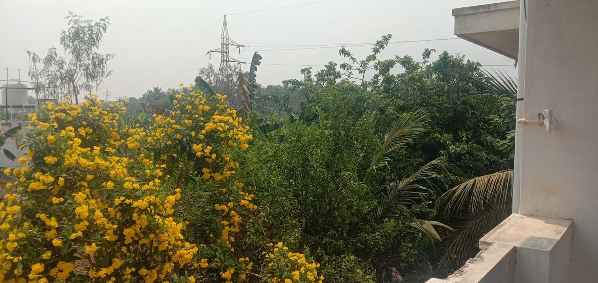 Planta entera para un grupo/familia de hasta 6 personas (incluye cama supletoria). 2 dormitorios, sala de estar, balcón abierto y cocina. A 12 minutos en coche del Centro Isha Yoga, la estatua de Aadiyogi y Dhyanalinga. ¡Rodeado de hermosas granjas, naturaleza y un montón de pájaros y loros! Lugar perfecto para los huéspedes que planean visitar el centro Isha Yoga. Todo el primer piso para ti, mientras que el anfitrión vive en la planta baja. Cocina totalmente funcional en la planta baja disponible para tu uso con ingredientes básicos.
