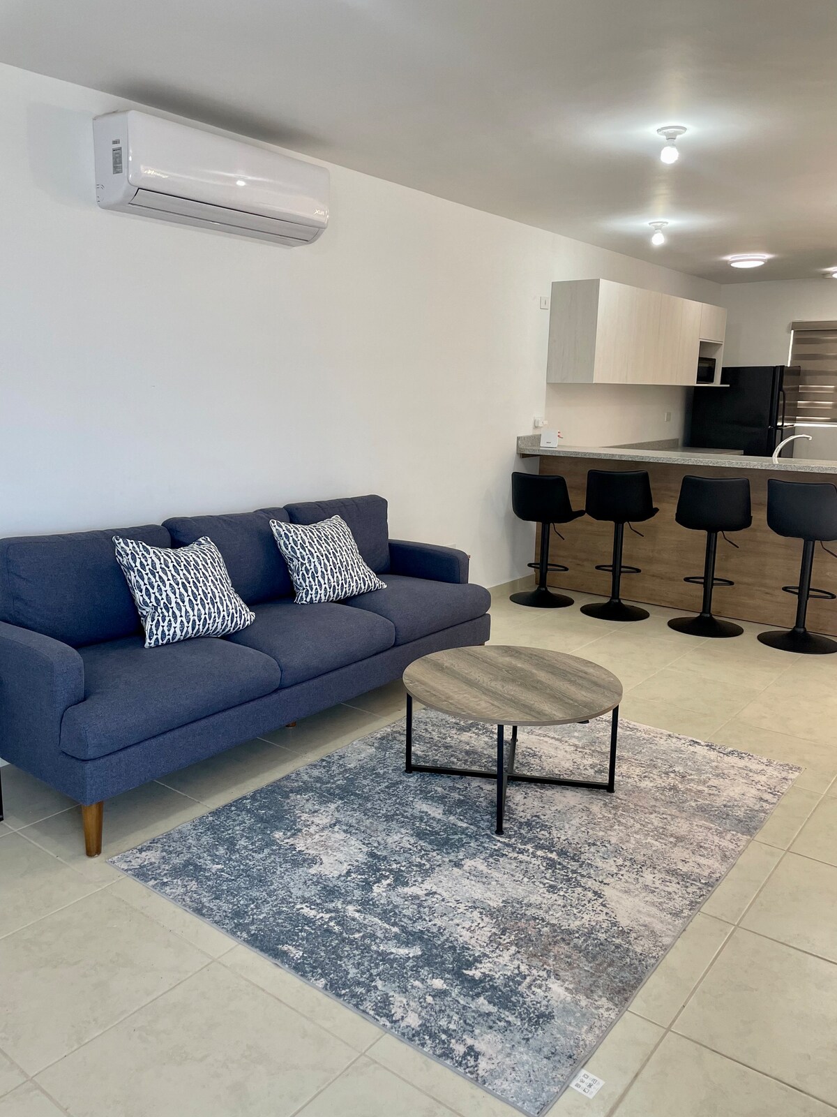 Es un lugar completamente nuevo, buenos espacios, cuenta con iluminación necesaria, los cuartos cuentan con sus aires acondicionados al igual que la sala, una cocina en la que puede encontrar todo lo necesario, refrigerador, parrilla, microondas, y utensilios. Cuenta con toallas para el baño completamente limpias, sabanas, almohadas, todo esto recién lavado para su estadía.