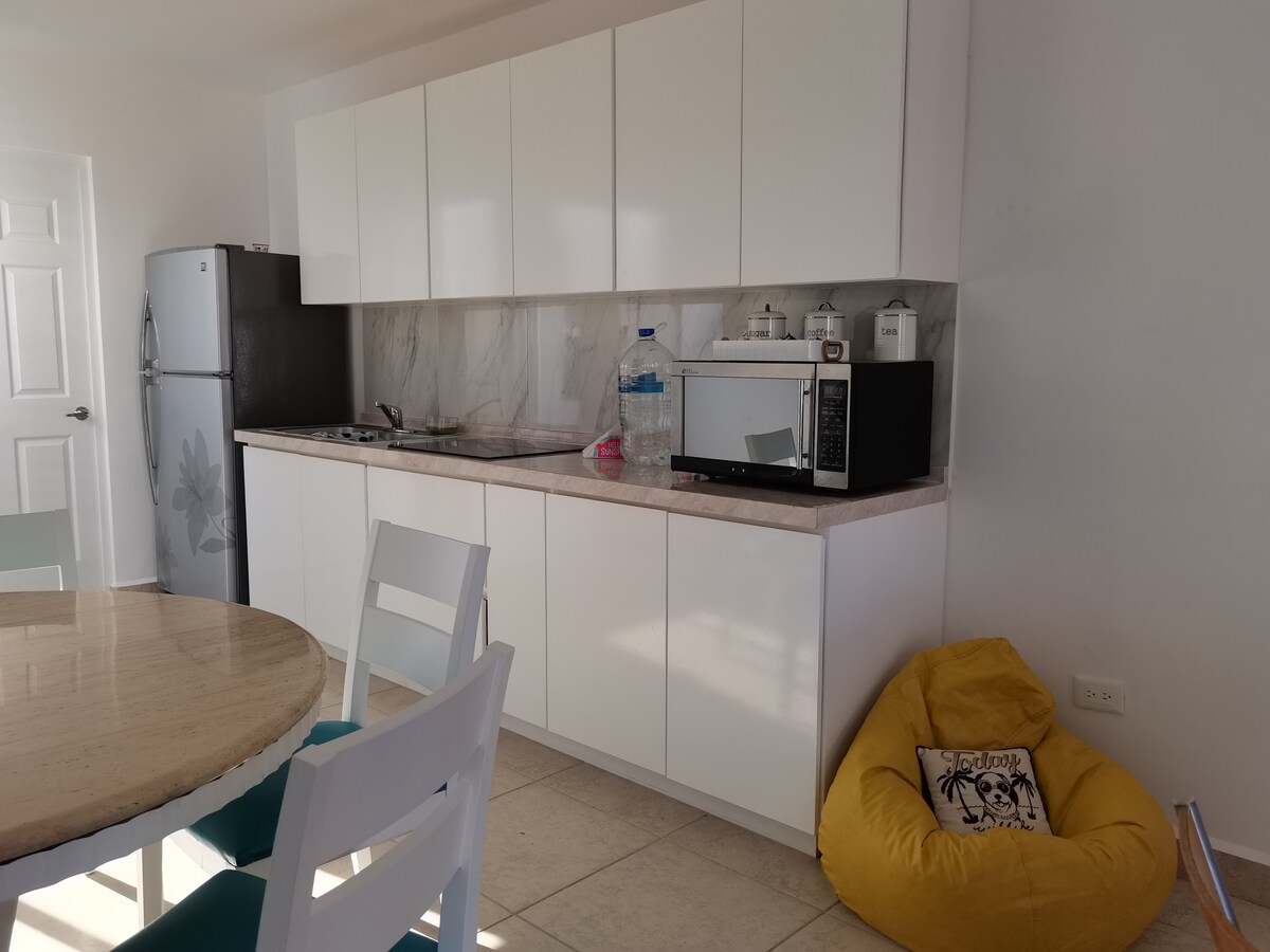 Es un lugar completamente nuevo, buenos espacios, cuenta con iluminación necesaria, los cuartos cuentan con sus aires acondicionados al igual que la sala, una cocina en la que puede encontrar todo lo necesario, refrigerador, parrilla, microondas, y utensilios. Cuenta con toallas para el baño completamente limpias, sabanas, almohadas, todo esto recién lavado para su estadía.