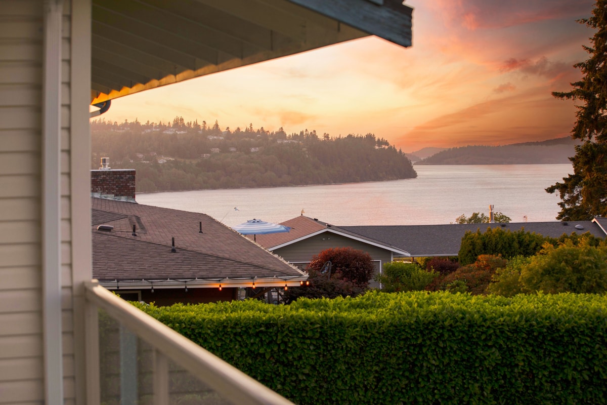 Tranquilo estudio en el sótano remodelado con entrada privada. Disfruta de un café por la mañana mientras contemplas las montañas olímpicas, las vistas al agua y las impresionantes puestas de sol. Las águilas y los águilas pescadoras vuelan por encima. ¡Esta propiedad que admite perros tiene un patio totalmente vallado! Disfruta de ropa de cama de lujo, sauna, chimenea, miel orgánica y café. La propiedad está equipada con Powerwalls para una alimentación continua durante los cortes. Hay acceso privado a la playa y patios cubiertos y descubiertos al aire libre, así como estacionamiento privado cerrado.