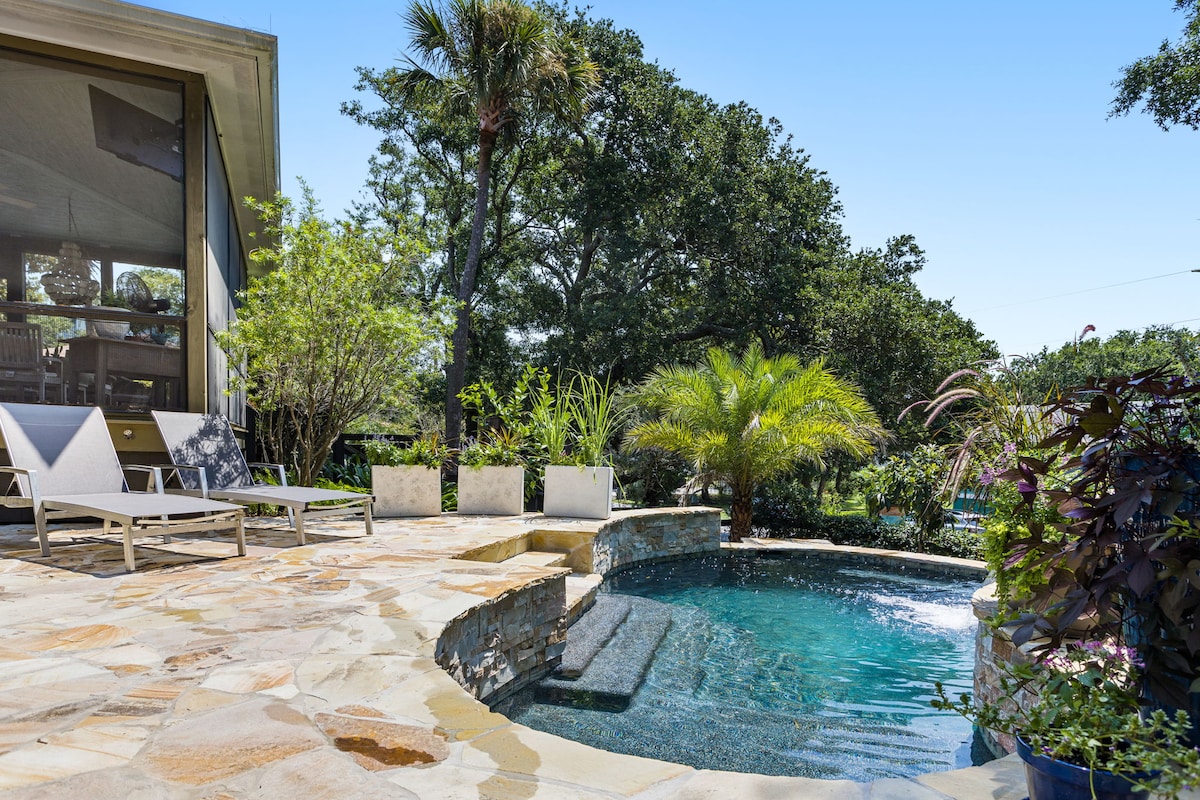 Luxuriate in the lagoon pool or large hot tub and listen to the ocean on this private dune. You CAN have it all: an intimate, luxurious, artsy, home on a hill above the Folly nightlife... 3 master bedrms/2 baths!) AND... ONLY 2 BLOCKS to Folly's center AND the beach.Unforgettable PORCH times! It's MASSIVE! ********One of the king beds/baths is an attached guest house. ***** Enjoy the sounds of the pool fountain and the walks to the pubs/restaurants!