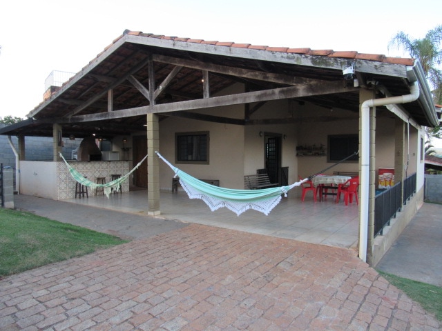 Casa tipo sobrado, estacionamento com espaço para 10 ou mais veículos, piscina infantil e adulto, campo gramado de futebol e vôlei. Área coberta com churrasqueira e forno para pizza. Acomoda até 20 pessoas, sendo 16 pessoas com cama completa com lençóis, travesseiros, cobertor e toalhas de banho, para os demais precisam trazer roupas de cama e toalhas de banho. Ar condicionado quente frio na suíte e nos quartos ventilador de teto. Por favor trazer bola.