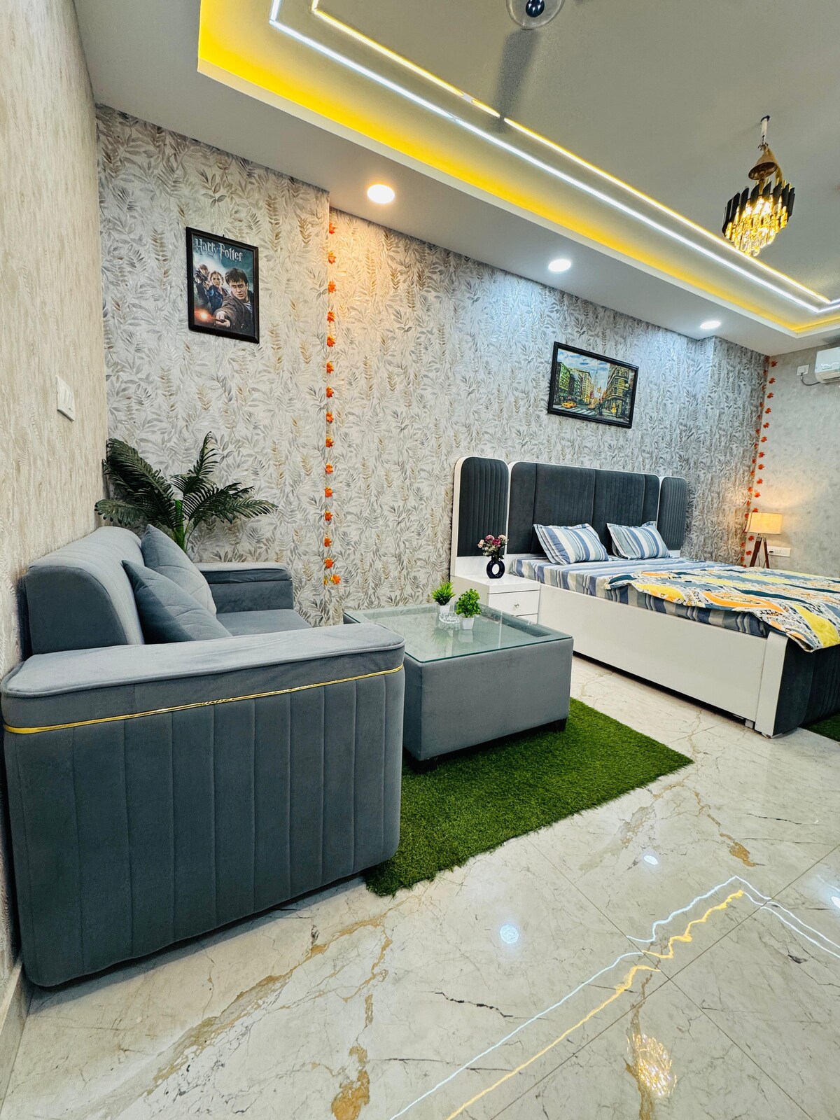 Bienvenido a este apartamento estudio bellamente diseñado situado en el corazón de Greater Noida West. Perfecto para viajeros solitarios, parejas o huéspedes de negocios, este estudio ofrece una estancia cómoda con todas las comodidades modernas. Lo que te encantará: Habitación amplia y bien iluminada con una lujosa cama tamaño queen. Elegante diseño de techo con iluminación ambiental y ventiladores con estilo. Smart TV con configuración de entretenimiento y cómodos asientos. Comodidad con aire acondicionado. Balcón privado. Refrigerador. Baño limpio y moderno.